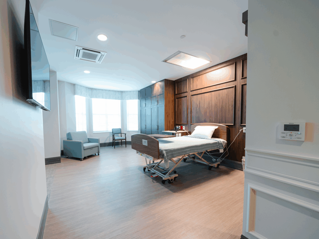 Our private suites include the option for a flex room, crafted with the same great attention to detail in fit and finish that you expect from The Farms. Each suite features a 42″ height-adjustable bed that can be lowered to less than 22″ from the floor to mitigate the risk of falls. They also include a comfortable, convertible chair that is designed for family and friends to use either as a daytime spot for chatting, or as a comfortable place to sleep.